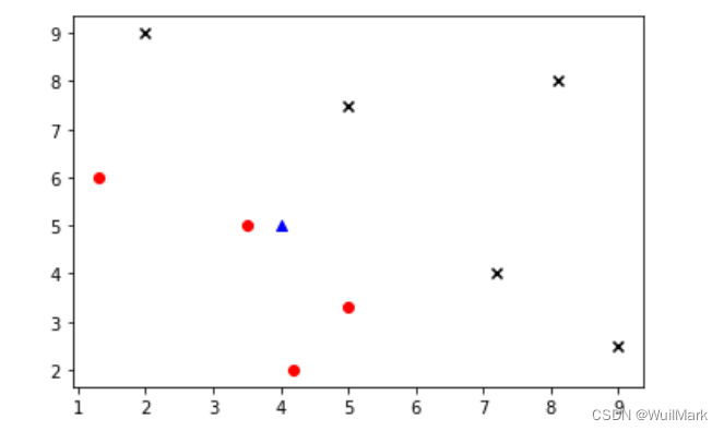 此刻,有一个位置的点(4,5),我们想判断它是属于红色部分还是蓝色部分,该怎么判断呢?