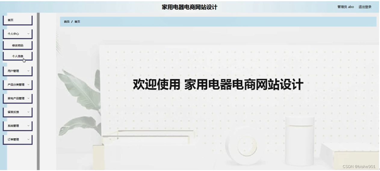 管理员登陆系统后,可以查看首页、个人中心、用户管理、产品分类管理、家电产品管理、留言反馈、系统管理、订单管理等功能,还能对每个功能逐一进行相应操作,如图5-9所示。