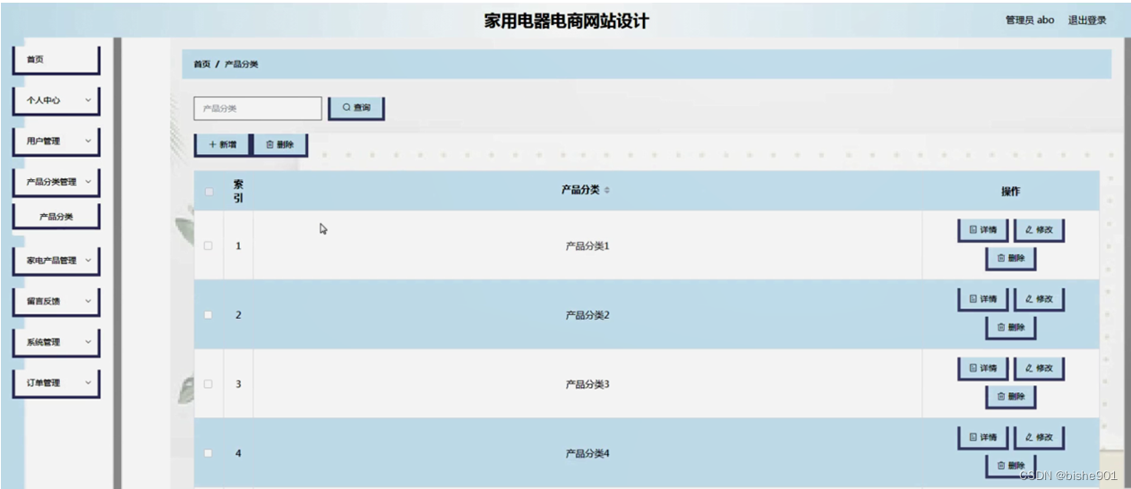 产品分类管理,在产品分类管理页面可以对索引、产品分类等内容进行详情,修改和删除操作,如图5-11所示。
