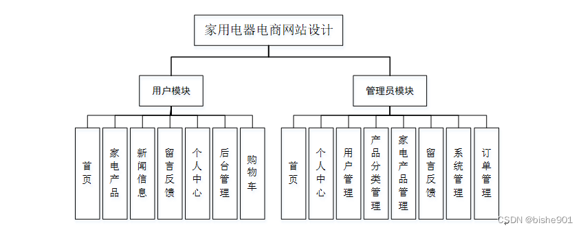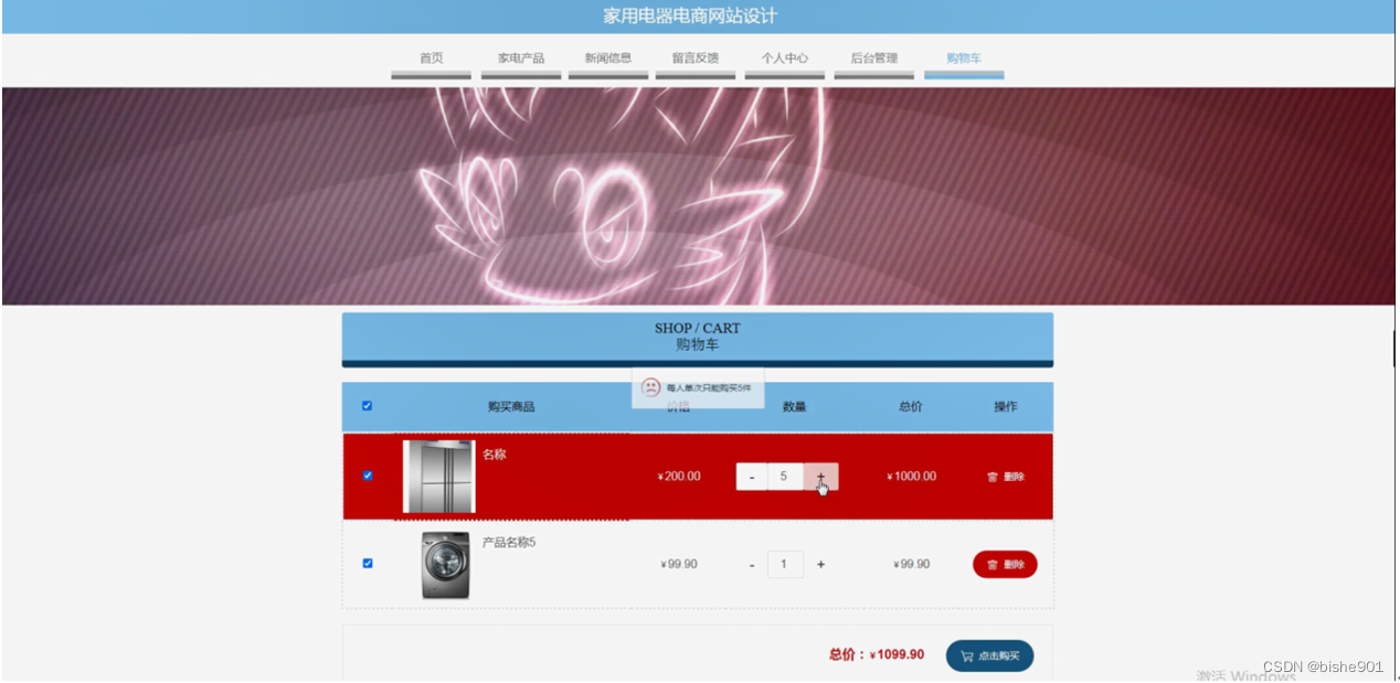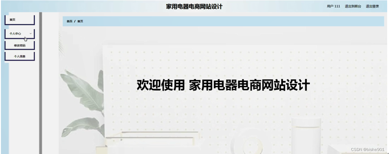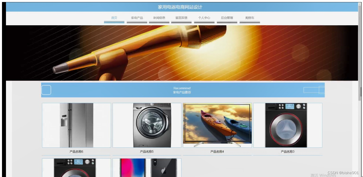 家用电器电商网站,在网站首页可以查看首页、家电产品、新闻信息、留言反馈、个人中心、后台管理、购物车等内容,并进行详细操作;如图5-1所示。