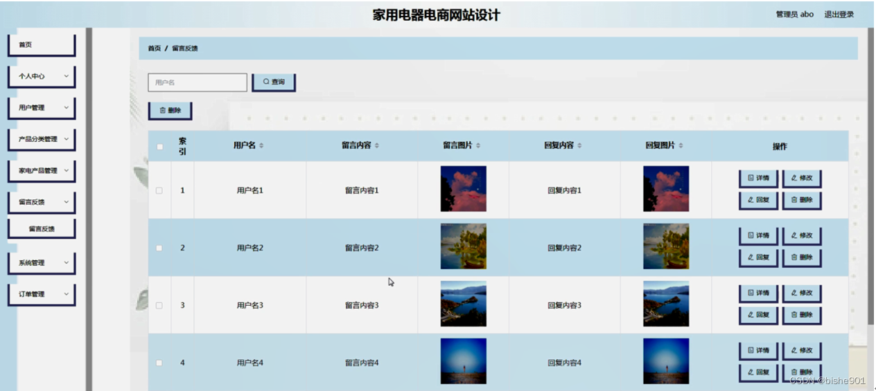 留言反馈,在留言反馈页面可以对索引、用户名、留言内容、留言图片、回复内容、回复图片等内容进行详情,修改,回复和删除操作,如图5-13所示。