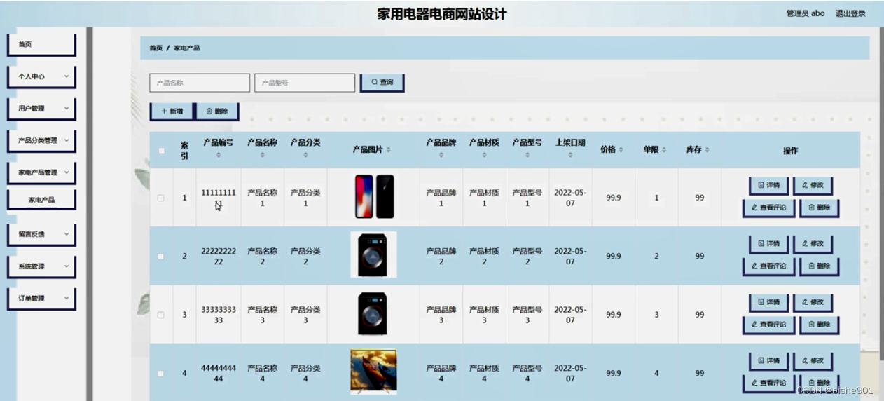 家电产品管理,在家电产品管理页面可以对索引、产品编号、产品名称、产品分类、产品图片、产品品牌、产品材质、产品型号、上架日期、价格、单限、库存等内容进行详情,修改,查看评论或删除操作,如图5-12所示。