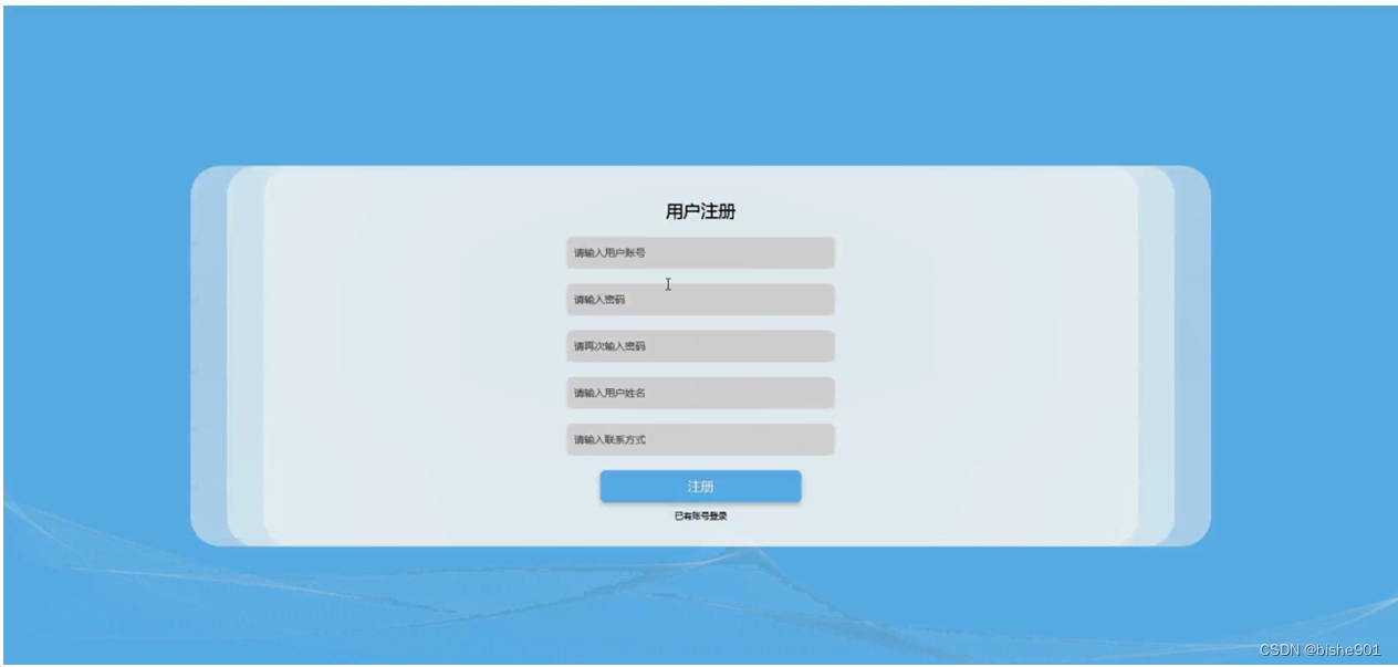 用户注册,在用户注册页面通过填写用户账号、密码、再次输入密码、用户姓名、联系方式等信息进行注册操作,如图5-2所示。
