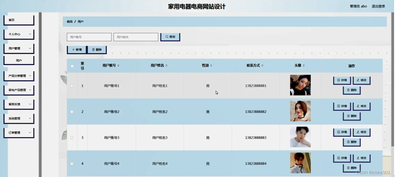 用户管理,在用户管理页面可以对索引、用户账号、用户姓名、性别、联系方式、头像等内容进行详情,修改和删除操作,如图5-10所示。