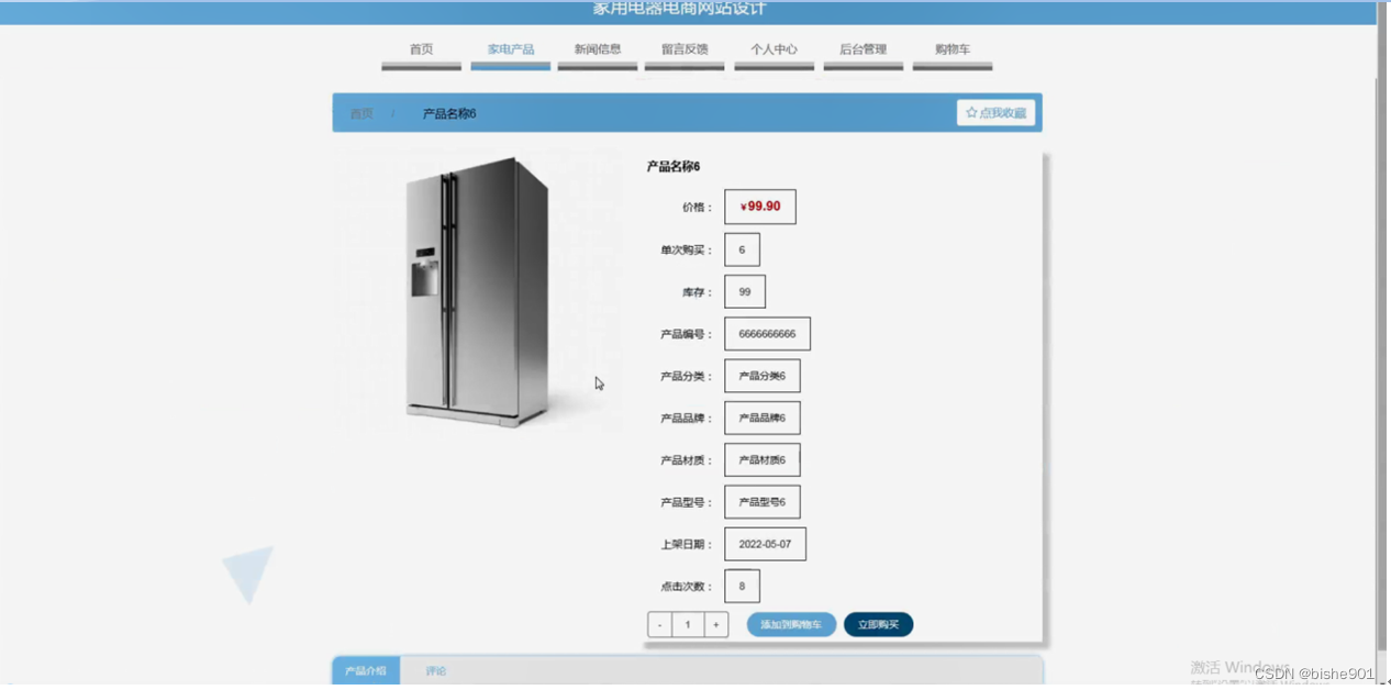 家电产品,在家电产品页面可以查看产品名称、价格、图片、单次购买、库存、产品编号、产品分类、产品品牌、产品材质、产品型号、上架日期、点击次数、产品介绍等内容,并进行添加到购物车,立即购买,评论或收藏操作,如图5-3所示。