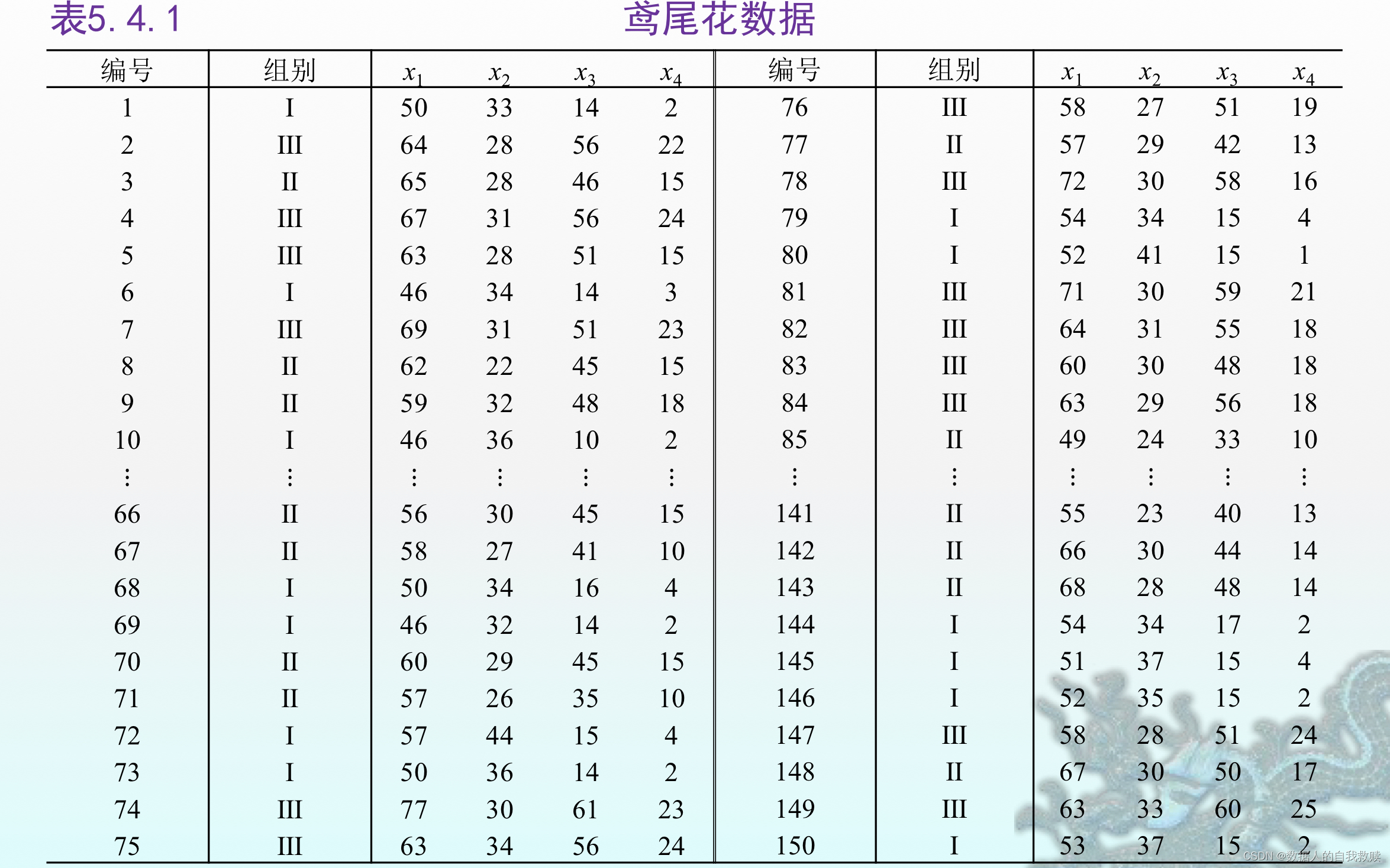 费希尔于1936年发表的鸢尾花数据被广泛地作为判别分析的例子。数据是对3种鸢尾花:刚毛鸢尾花(第一组)、变色鸢尾花(第二组)和弗吉尼亚鸢尾花(第三组)各抽取一个容量为50地样本,测量其花萼长()、花萼宽(