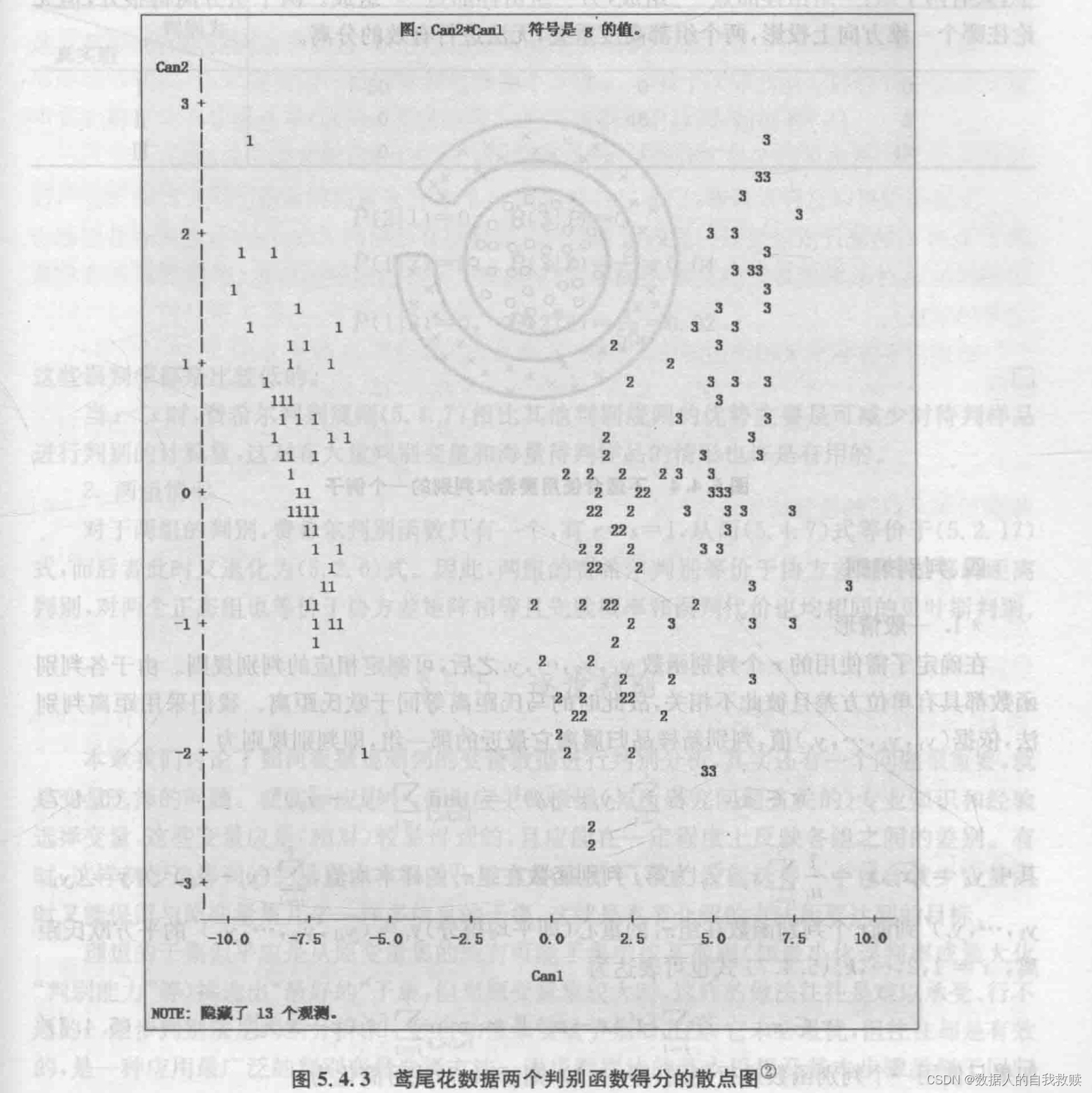 能够利用降维后生成的图形进行直观判别是费希尔判别的最重要应用,图中常常能清晰地展示出丰富的信息,如发现构成各组的结构、离群样品点或数据中的其他异常情况等。