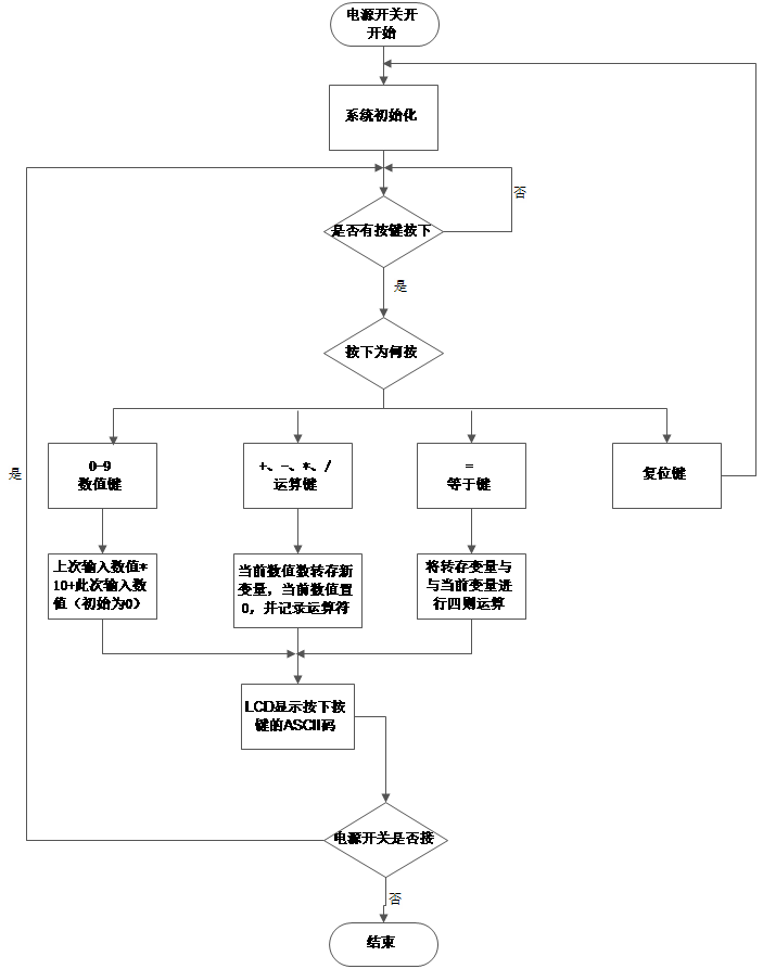 程序运行时,首先会判断是否按键按下,若有按键按下确定是哪个按键。并在LCD上显示,按下等号后开始计算,并在LCD上显示结果,并再次判断是否有按键按下,程序循环。若按下复位,程序恢复到初始状态。