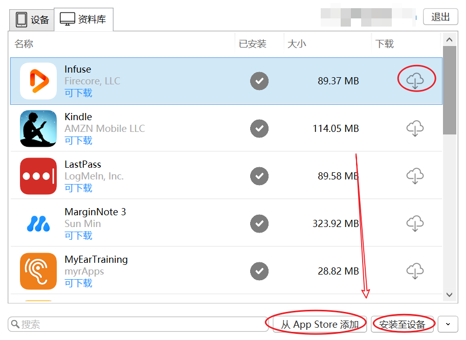 如图所示,我们可以通过点击iMazing右侧的下载图标将购买过的应用下载安装到iOS设备,并且还可以直接点击下方“从App Store添加”的选项卡直接添加下载新应用。