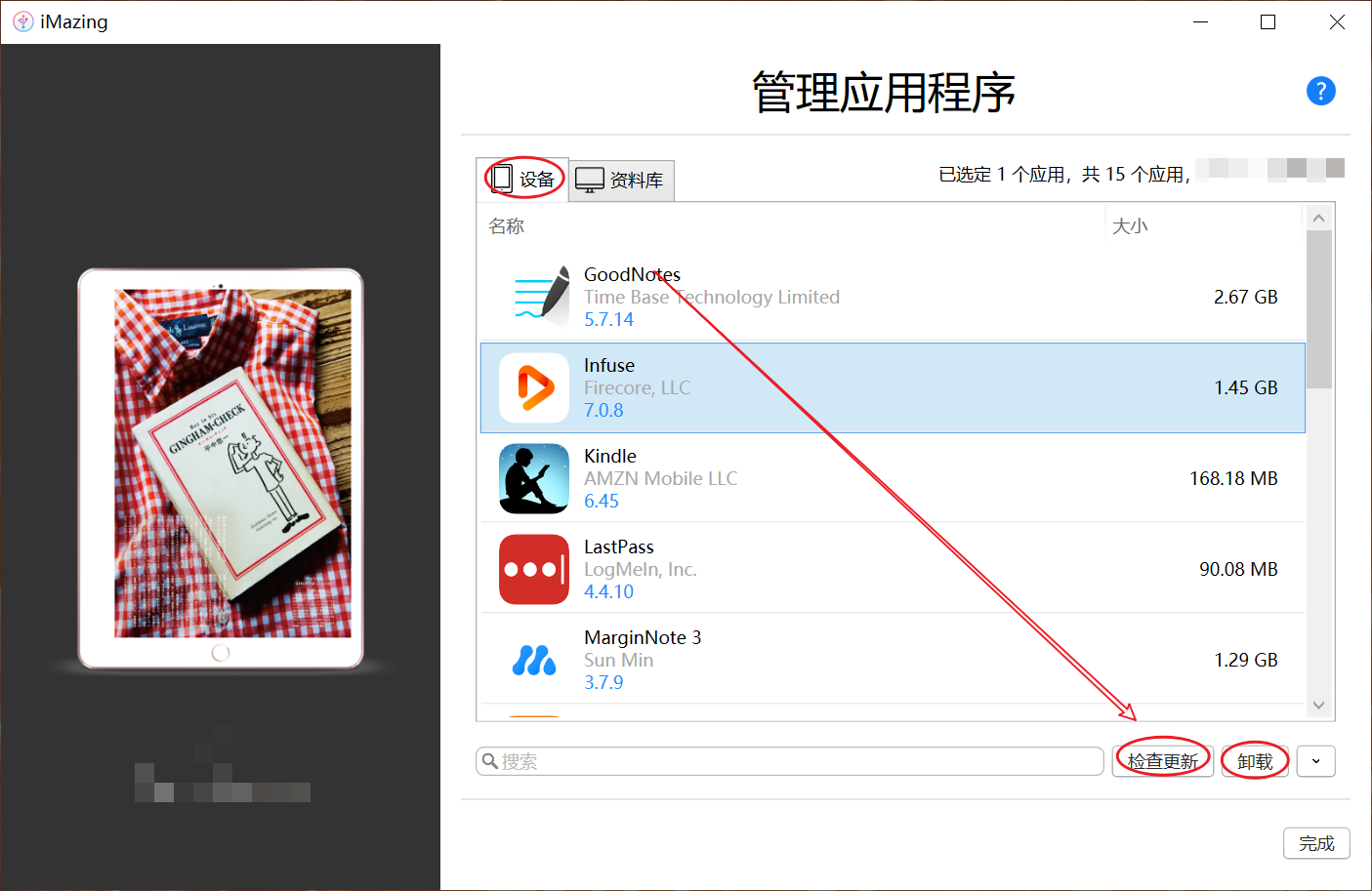 如图所示,iMazing管理应用程序分为两个板块。第一个板块是管理设备,即iOS设备上目前下载的应用程序。我们可以通过iMazing来对任意应用程序实施检查更新和卸载的操作。
