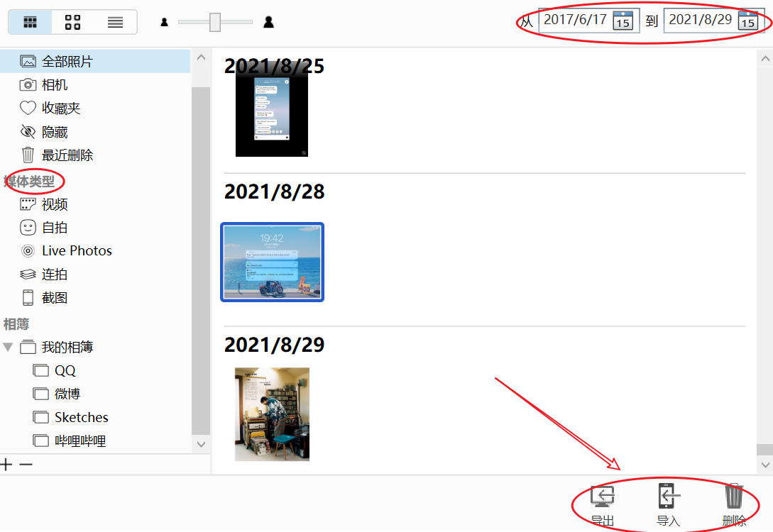 iMazing将iOS图库中的照片按类型和时间归类,缩减我们检索照片的时间,并且还提供了照片的详细信息。我们通过iMazing也可以批量导入、导出和删除照片文件。