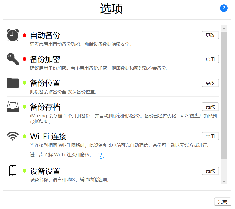 iMazing的备份功能比iTunes更加全面且灵活,我们可以打开备份选项设置,自主决定iOS数据备份的位置、备份数据更新的周期,还可以对备份信息进行加密操作。
