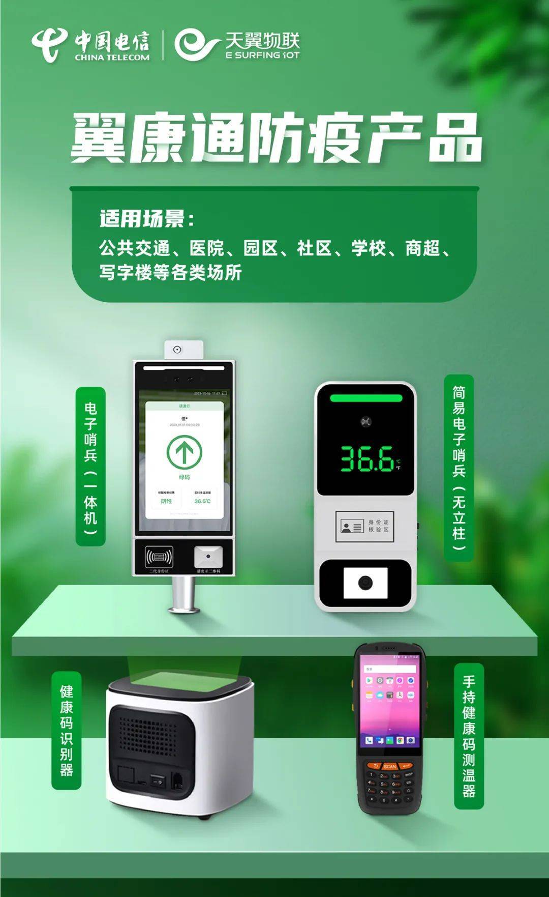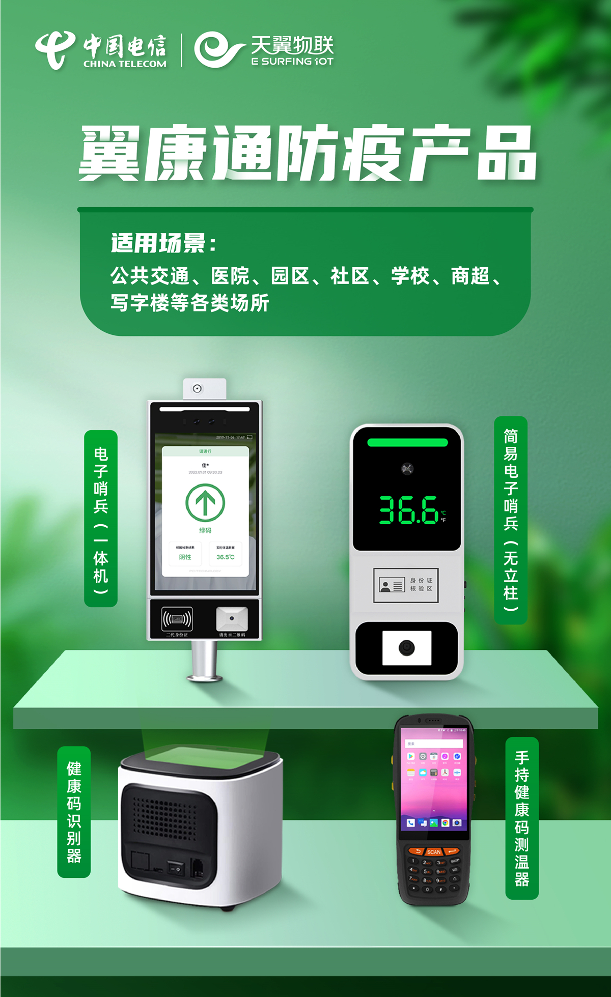 翼康通系列产品包括电子哨兵(一体机)、手持健康码测温器、健康码识别器等多形态终端,广泛应用于医院、车站、商超、园区、写字楼等各类场所,将“人防”转化为“技防”,赋能精准防疫。
