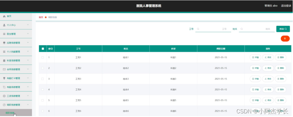 调职信息管理,在调职信息管理页面中可以对索引、工号、姓名、科室、调职日期等信息进行详情,修改或删除等详细操作,如图5-13所示。