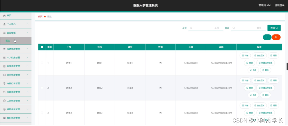 医生管理,在医生管理页面中可以对索引、工号、姓名、科室、性别、手机、邮箱等信息进行详情、发放工资、调职、复职、新建应聘信息、修改或删除等操作,如图5-5所示。