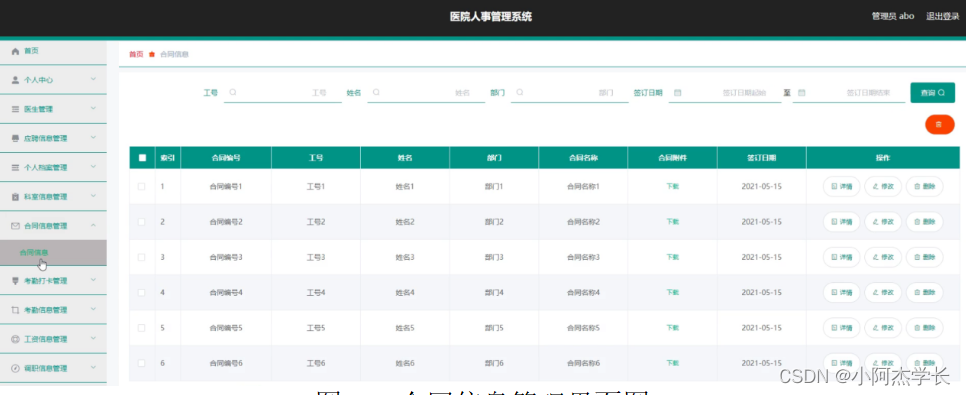 合同信息管理,在合同信息管理页面中可以对索引、合同编号、工号、姓名、部门、合同名称、合同附件、签订日期等信息进行详情,修改或删除等详细操作,如图5-9所示。