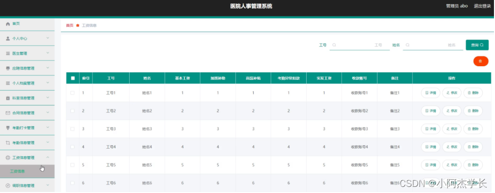 工资信息管理,在工资信息管理页面中可以对索引、工号、姓名、基本工资、加班补助、高温补贴、考勤异常扣款、实发工资、收款账号、备注等信息进行详情,修改或删除等详细操作,如图5-12所示。
