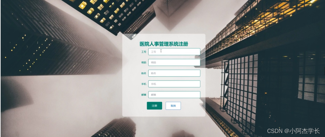 医生注册,在医生注册页面通过填写工号、密码、姓名、手机、邮箱等信息进行注册操作,如图5-3所示。