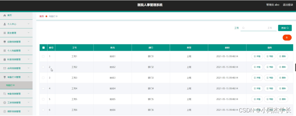 考勤打卡管理,在考勤打卡管理页面中可以对索引、工号、姓名、部门、类型、时间等信息进行详情、考勤或删除等详细操作,如图5-10所示。