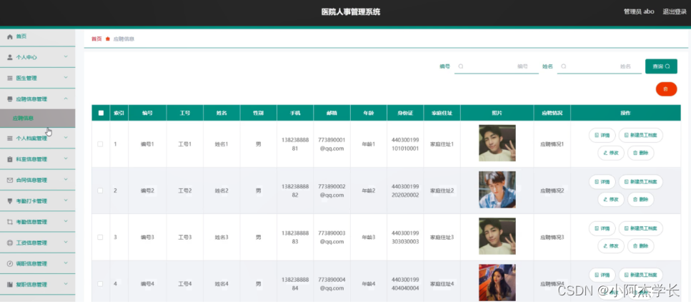 应聘信息管理,在应聘信息管理页面中可以对索引、编号、工号、姓名、性别、手机、邮箱、年龄、身份证、家庭住址、照片、应聘情况等信息进行详情、新建员工档案、修改或删除等详细操作,如图5-6所示。