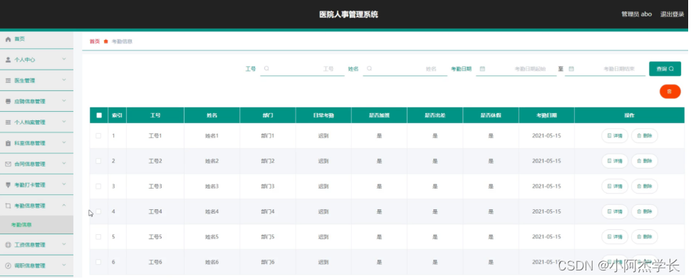考勤信息管理,在考勤信息管理页面中可以对索引、工号、姓名、部门、日常考勤、是否加班、是否出差、是否休假、考勤日期等信息进行详情或删除等详细操作,如图5-11所示。