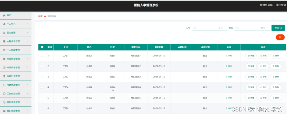 离职信息管理,在离职信息管理页面中可以对索引、工号、姓名、科室、离职原因、离职日期、审核回复、审核状态、审核等信息进行详情,修改或删除等详细操作,如图5-15所示。