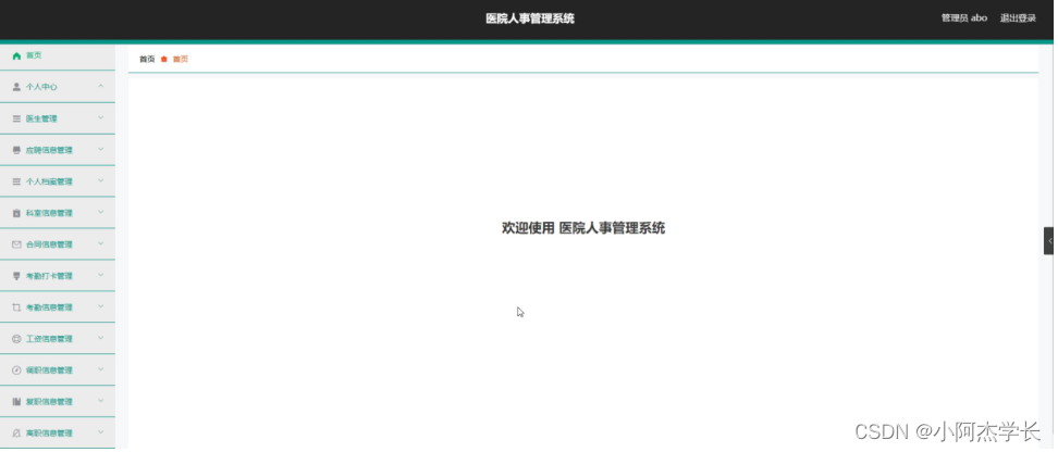 管理员登录进入医院人事管理系统可以查看首页、个人中心、医生管理、应聘信息管理、个人档案管理、科室信息管理、合同信息管理、考勤打卡管理、考勤信息管理、工资信息管理、调职信息管理、复职信息管理、离职信息管理等信息进行相应操作,如图5-4所示。