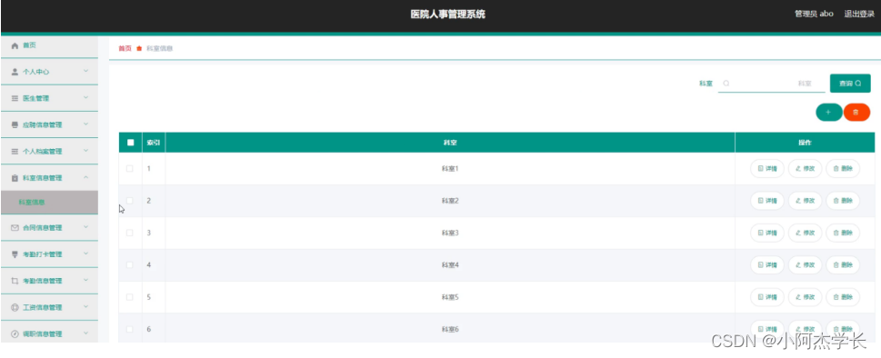 科室信息管理,在科室信息管理页面中可以对索引、科室等信息进行详情,修改或删除等详细操作,如图5-8所示。