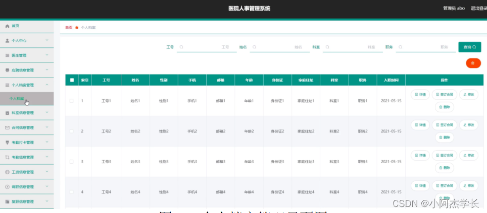 个人档案管理,在个人档案管理页面中可以对索引、工号、姓名、性别、手机、邮箱、年龄、身份证、家庭住址、科室、职务、入职时间等信息进行详情、签证合同、修改或删除等详细操作,如图5-7所示。