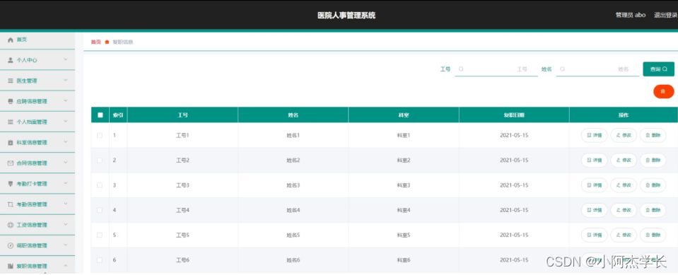 复职信息管理,在复职信息管理页面中可以对索引、工号、姓名、科室、复职日期等信息进行详情,修改或删除等详细操作,如图5-14所示。