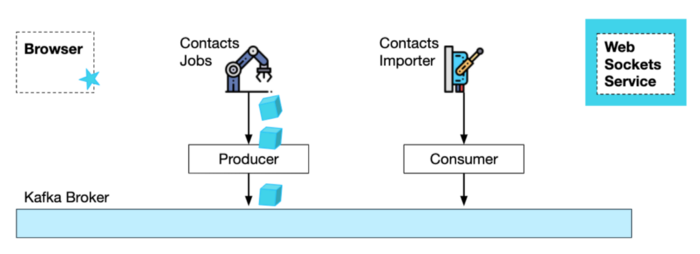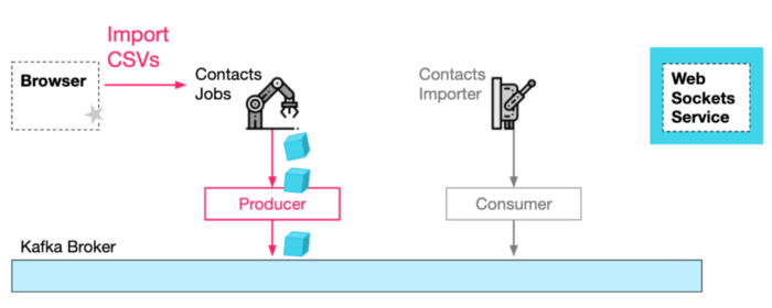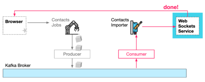 HTTP 导入请求 + 生成的导入作业消息 第四,Contacts 导入服务消费来自 Kafka 的作业请求并执行实际的导入任务。当它完成时,它可以通知websockets 服务工作已经完成,这反过来可以通知浏览器。
