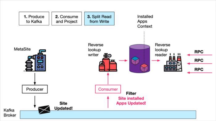 其次,他们使用自己的数据库创建了一个“只写”服务(反向查找写入器),该服务使用站点元数据对象,但仅获取已安装应用程序上下文并将其写入数据库。即,它将站点元数据的某个“视图”(已安装的应用程序)投射到数据库中。
