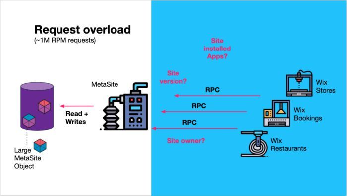 那些非常受欢迎的服务会成为瓶颈 当您遇到存储大型领域对象的“流行”数据的瓶颈时,此模式可以提供帮助。 在 Wix,我们的MetaSite服务就是这种情况,它为 Wix 用户创建的每个站点保存了大量元数据,例如站点版本、站点所有者以及站点上安装了哪些应用程序-已安装的应用程序上下文。 此信息对于 Wix 的许多其他微服务(团队)很有价值,例如Wix Stores、Wix Bookings、Wix Restaurants等等。这个单一的服务被超过 100 万 RPM 的请求轰炸,以获取网站元数据的各个部分。 通过查看服务的各种 API 可以明显看出,它正在处理其客户端服务的太多不同的问题。