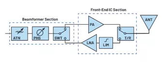 如下图所示是相控阵天线的典型RF前端,衰减器和移相器负责对发射/接收信号的幅度和相位进行赋值,发射链路中需要采用功率放大器将小信号能量放大,接收链路中需要滤波器和低噪放将需要频段的小信号进行放大,然后送往后端进行数字波束合成。