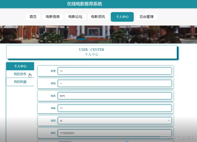 前台功能:用户登录注册后进入系统首页,可以实现首页.电影信息.电影论坛.电影资讯.个人中心.后台管理等功能等内容进行详细操作;