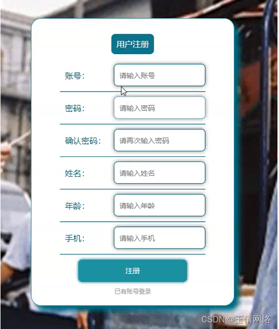 用户注册,在用户注册页面,用户通过填写账号.密码.确认密码.姓名.年龄.手机.等信息进行注册操作,如图4-2所示。
