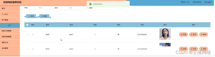 用户管理,在用户列表可以对索引.账号.姓名.年龄.性别.手机.照片.等内容进行查看,修改和删除等操作,如图4-7所示。
