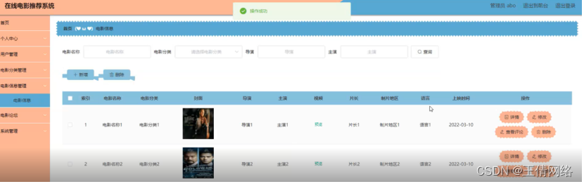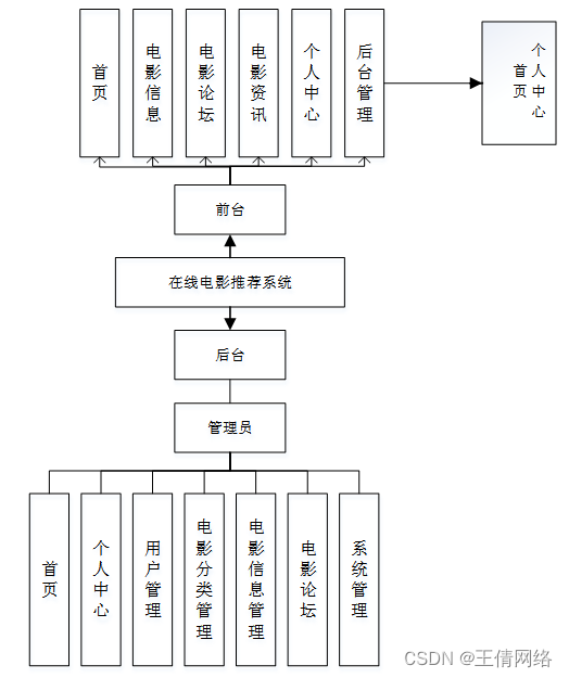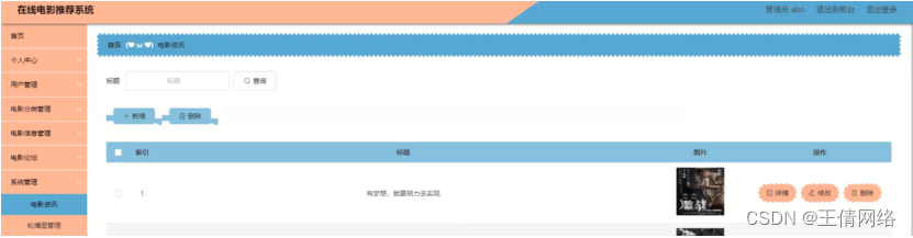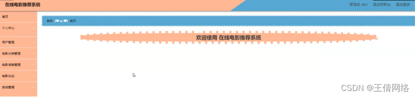 后台主要是管理员,管理员功能包括首页.个人中心.用户管理.电影分类管理.电影信息管理.电影论坛.系统管理等;