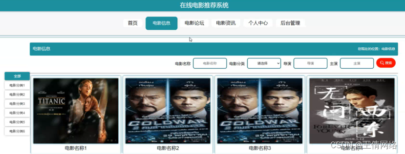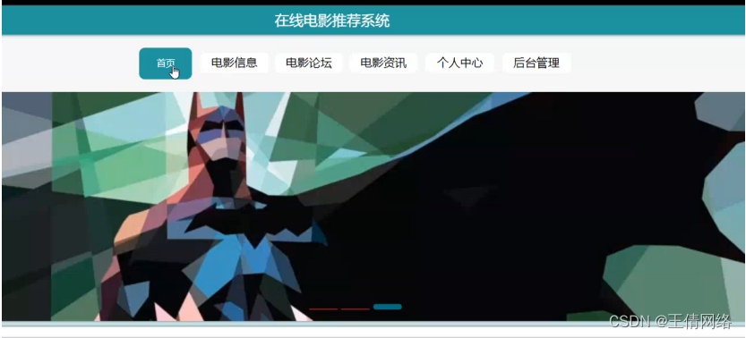 在线电影推荐系统,在系统首页可以查看首页.电影信息.电影论坛.电影资讯.个人中心.后台管理等功能等内容,并进行详细操作;如图4-1所示。