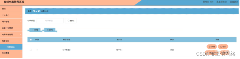 电影论坛,电影论坛页面可以查看索引.帖子标题.用户名.状态等内容进行修改,查看评论和删除操作,如图4-10所示。