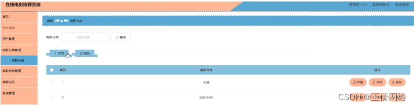 电影分类管理,在电影分类页面可以对索引.电影分类等详情内容进行查看,修改和删除操作,如图4-8所示。