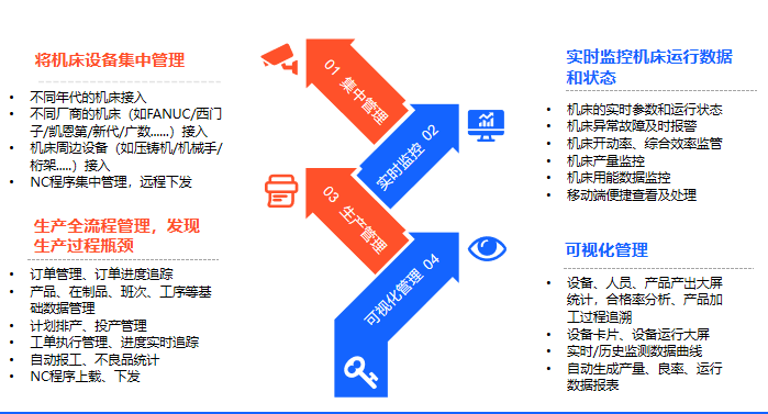 机床行业工业互联网平台针对机加工企业、机床生产企业提供宣传、接单等市场价值;提供车间生产实况在移动端、电脑端实时监控、查看等用户价值;提供机床故障预警维保管理可控、生产进度管理可控、生产原料管理可控、远程运维管理可控等生产价值。覆盖机床企业领导、车间主任、生产工人等多部门业务协同需求,从而提升企业经营管理效率。