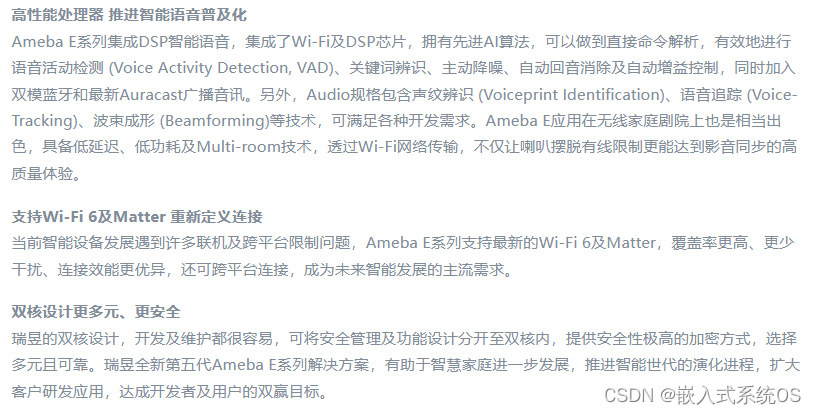 Ameba E系列分别为Ameba Lite:RTL8720E、Ameba Lite Plus (RTL8726E)及Ameba Smart (RTL8730E),支持智能语音、双核运算、Wi-Fi 6、蓝牙5.3、Matter等最新技术,能轻松有效的升级智能家庭系统