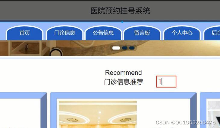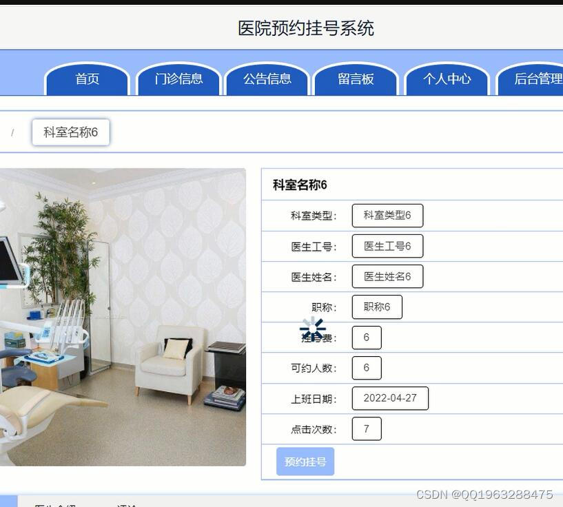 主要对主页,个人中心、用户管理、医生管理、门诊信息管理、预约挂号管理、取消预约管理、改约通知管理、留言板管理、系统管理的实现。