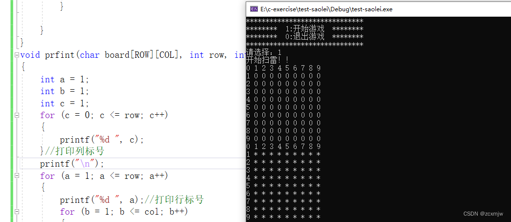 prfint(mine, ROW, COL);//打印棋盘