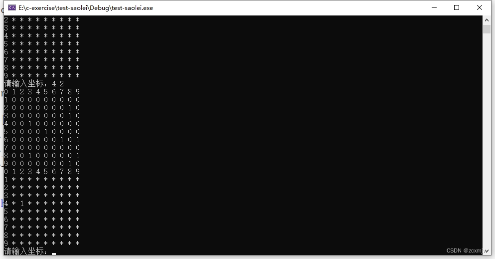 排雷我们主要是通过输入坐标,然后在mine棋盘上排查坐标周围雷的数量,在将数量传给show棋盘中的对应坐标。