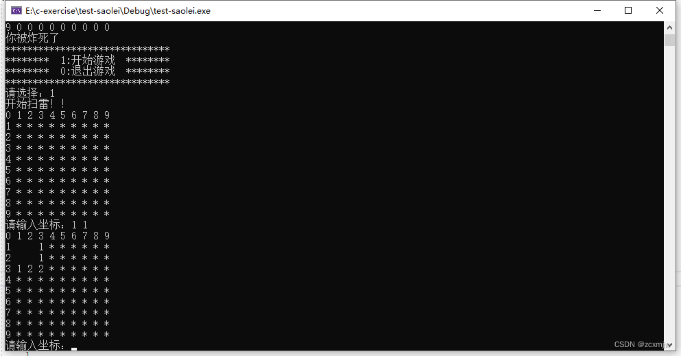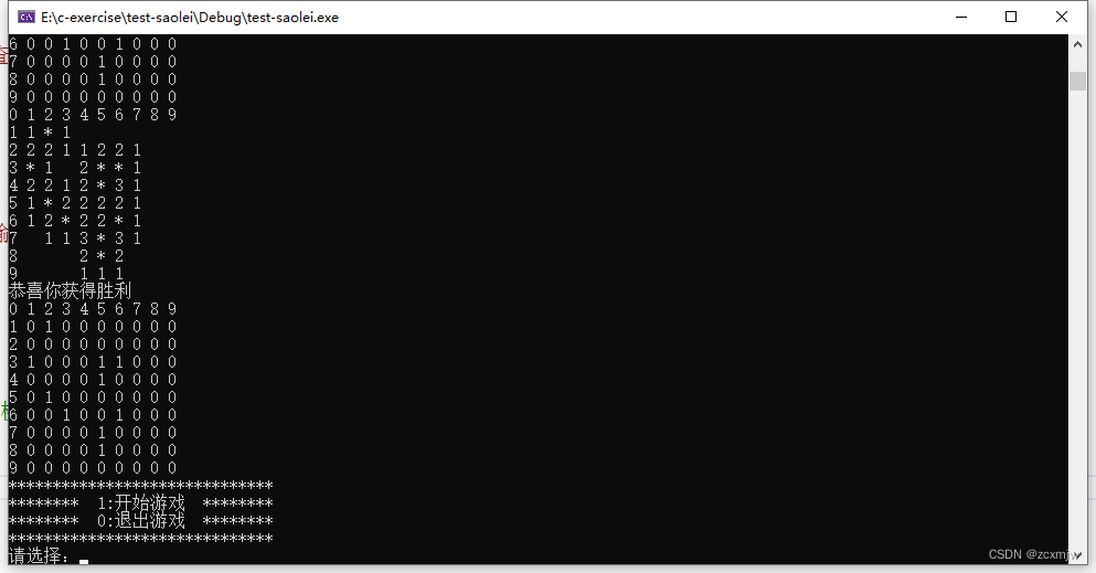 因为有十个雷,所以我们可以通过判断每次输入坐标,建立变量win,show棋盘每输入一个值,win++,当win大于71(棋盘总数-雷数)时则跳出循环胜利。