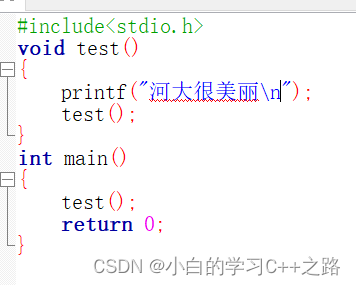 是什么呢?是打印一段话。打印完之后我们又在test函数中调用了本身。并在main函数