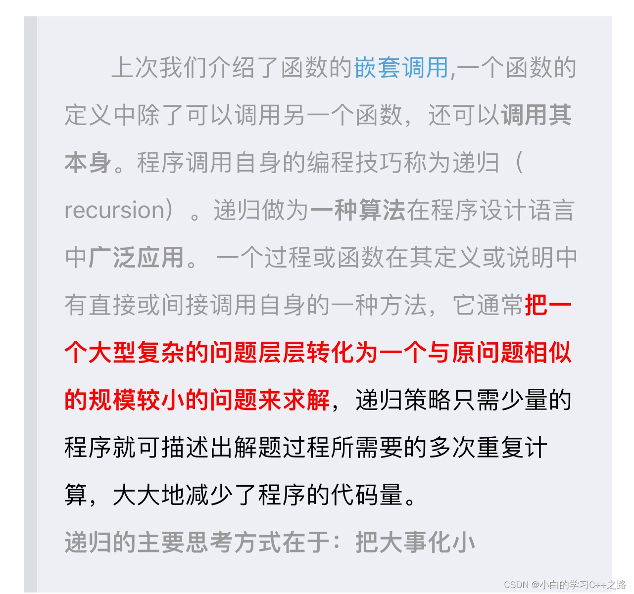 把一个很大的问题。抽象出与其相似的子问题。再把子问题抽象成一个更小的子问题。