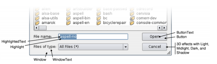 Qt中的窗体或控件都是Widget类,Qt中提供的调色板QPalette类就是专门用于管理控件的外观显示。